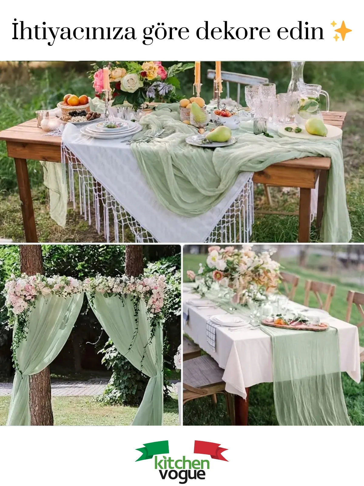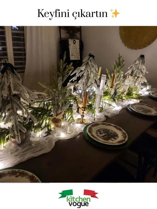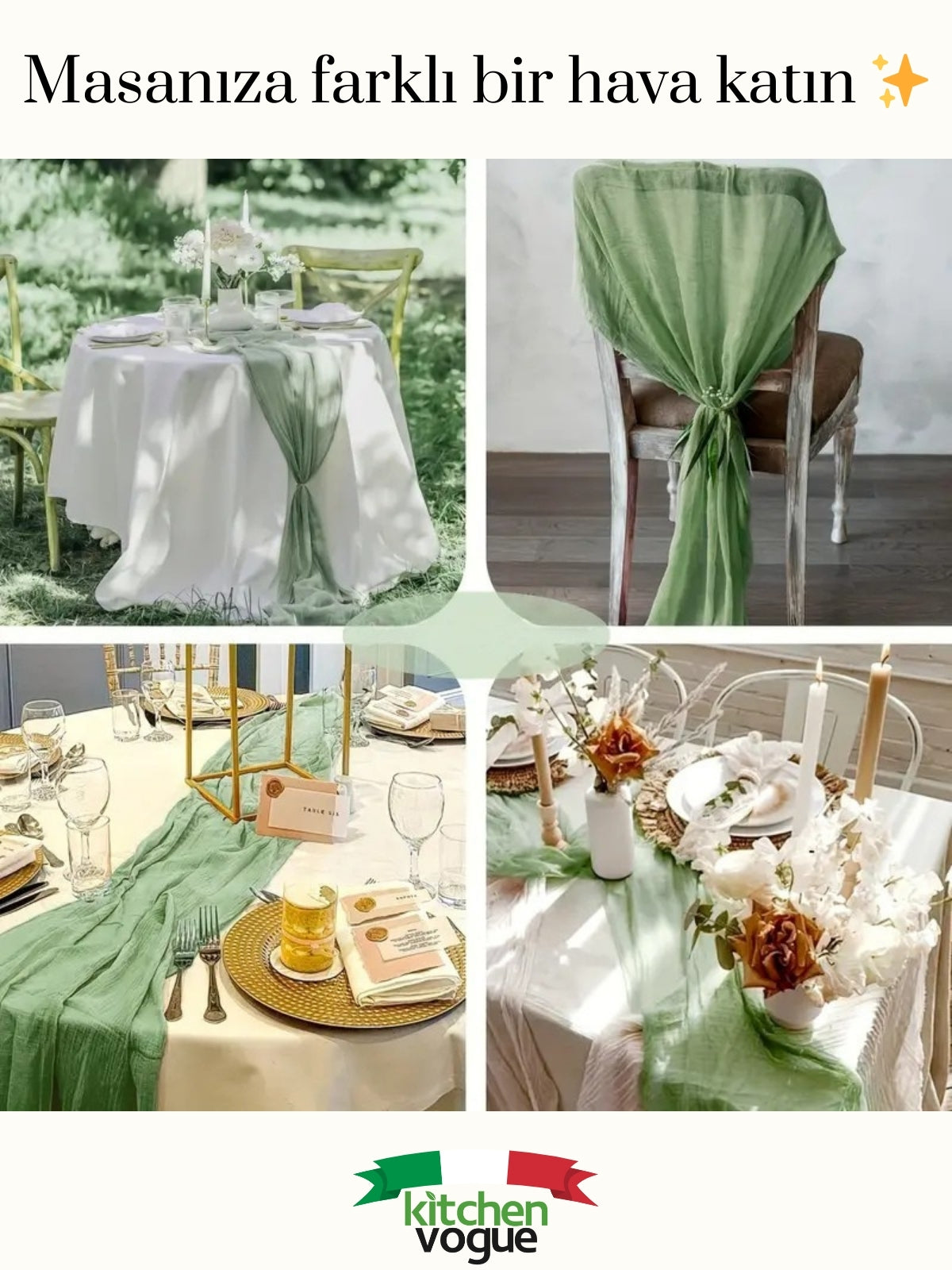 %100 Pamuklu Bohem Masa Örtüsü Dekoratif Runner Beyaz Adaçayı Yeşili